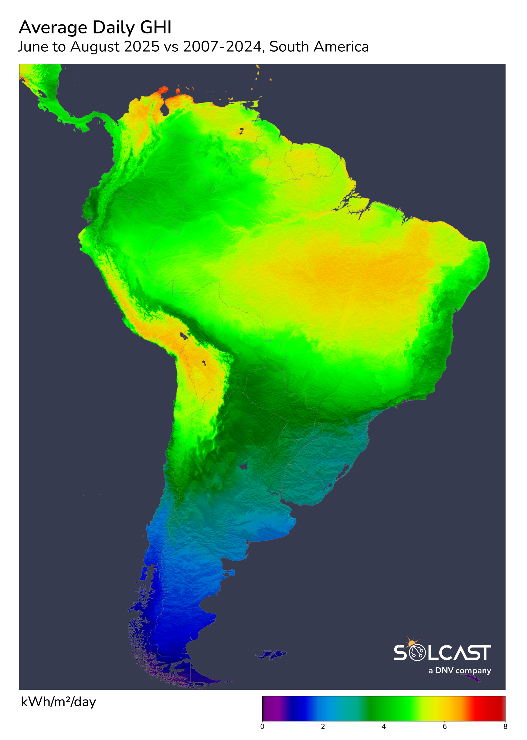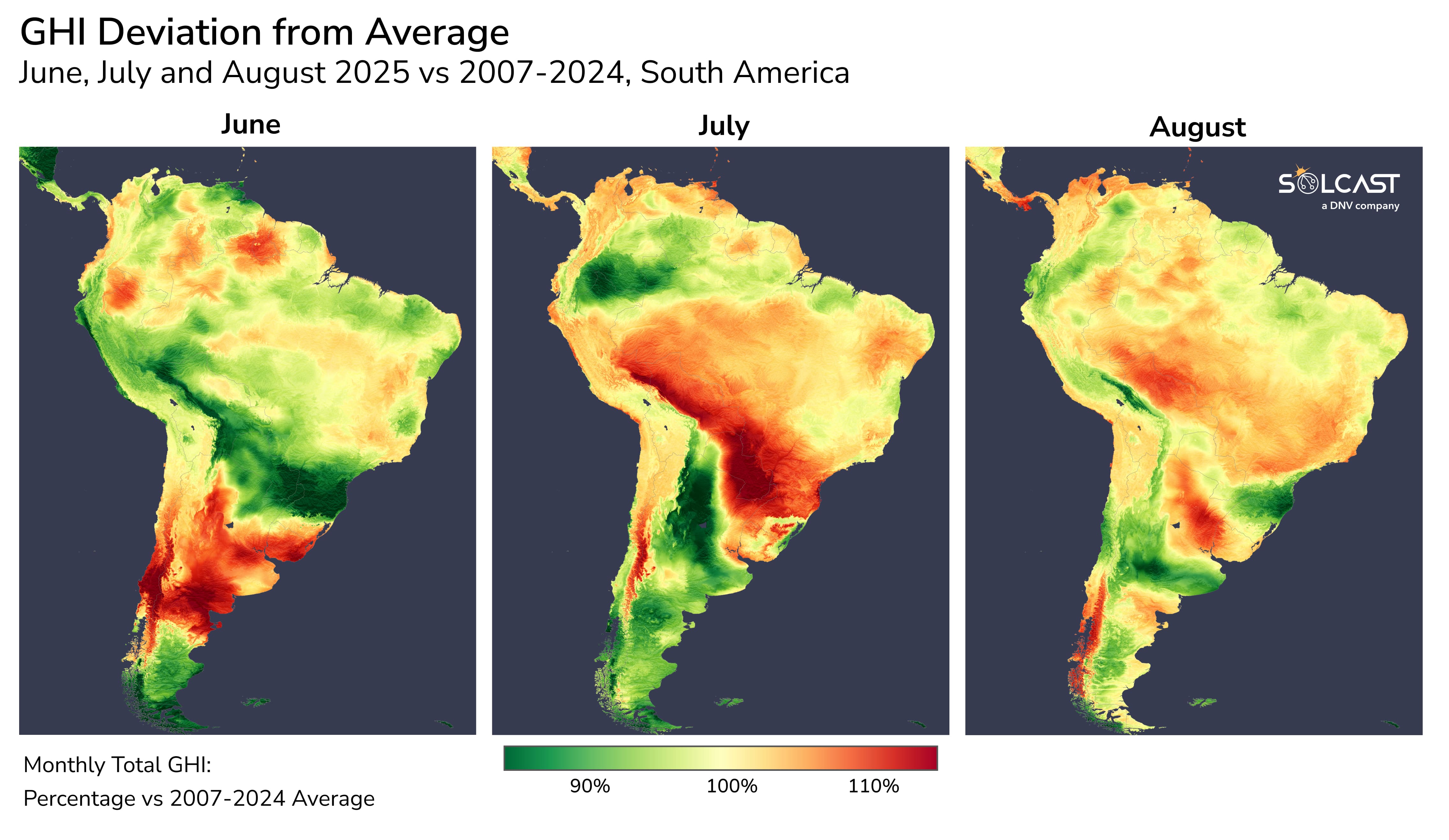Winter in South America brought sharp month-to-month contrasts for solar generation, as the region experienced swings between unusually cold conditions and clear skies. While June and July largely offset one another in terms of irradiance anomalies, August closed the season with more balanced conditions, resulting in a slight net increase in available irradiance across large parts of the continent. Meanwhile, extreme cold in the southern cone tested energy systems and brought rare winter events to some of the sunniest regions in the world.