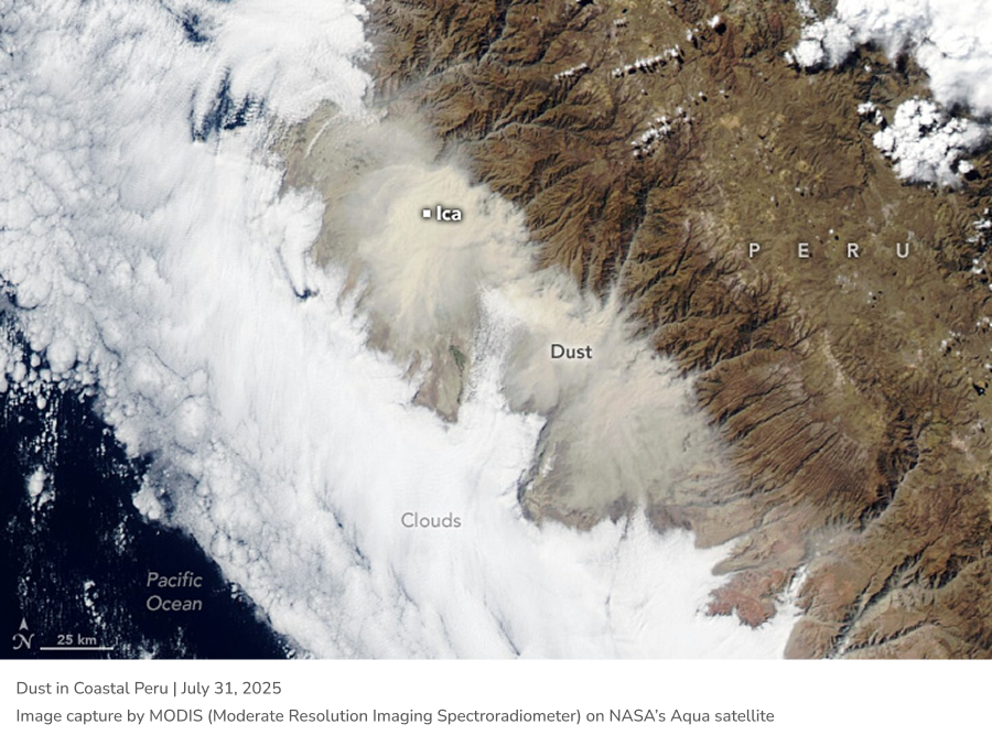 In Peru, a major dust storm in July offered a clear example of how aerosols can match or even exceed cloud in their impact on solar irradiance. Imagery from NASA's Aqua satellite showed thick plumes of dust being driven inland by strong winds, where they collected along the western slopes of the Andes. The resulting irradiance losses were more significant than those caused by dense cloud cover, highlighting the relevance of aerosol monitoring in arid and semi-arid regions such as the west coast of South America.